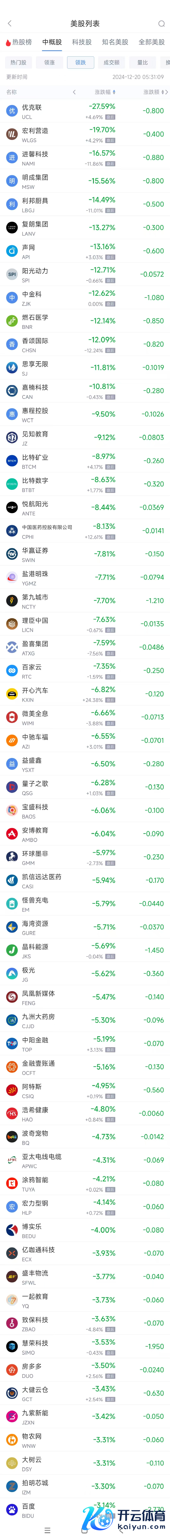 领跌中概股列表:
