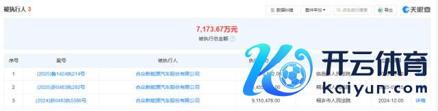 值得一提的是,在哪吒汽车进行 E 轮融资的同期,其股权冻结和被推论东说念主信息也在增多。天眼查夸耀,干涉 2025 年以来,哪吒汽车新增了 14 条股权冻结和 2 条被推论东说念主信息。其中,1 月 23 日,合众汽车新增一则推论标为 5717 万余元的被推论东说念主信息,加上 2025 年 1 月 15 日被桐乡市东说念主民法院强制推论的约 545 万元,以及 2024 年 12 月 5 日强制推论的约 911 万元,合众汽车被推论总金额已超 7000 万元。